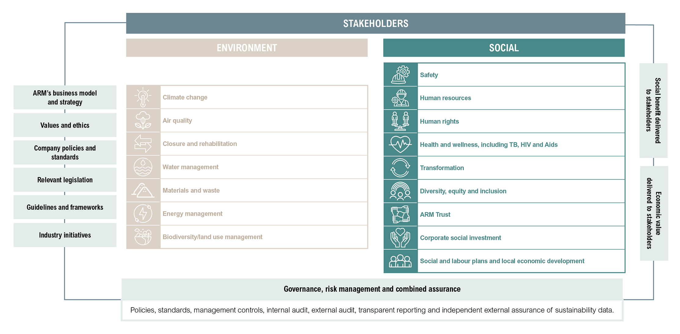 ARM’s values, governance structures and ethical leadership guide our actions to conduct our business activities with integrity and respect for the environmental and societal contexts in which we operate. As a leading mining and minerals company, ARM is cognisant not only of our impacts on the world around us, but also of the opportunities to make a positive contribution to growth and development in the societies in which we operate.